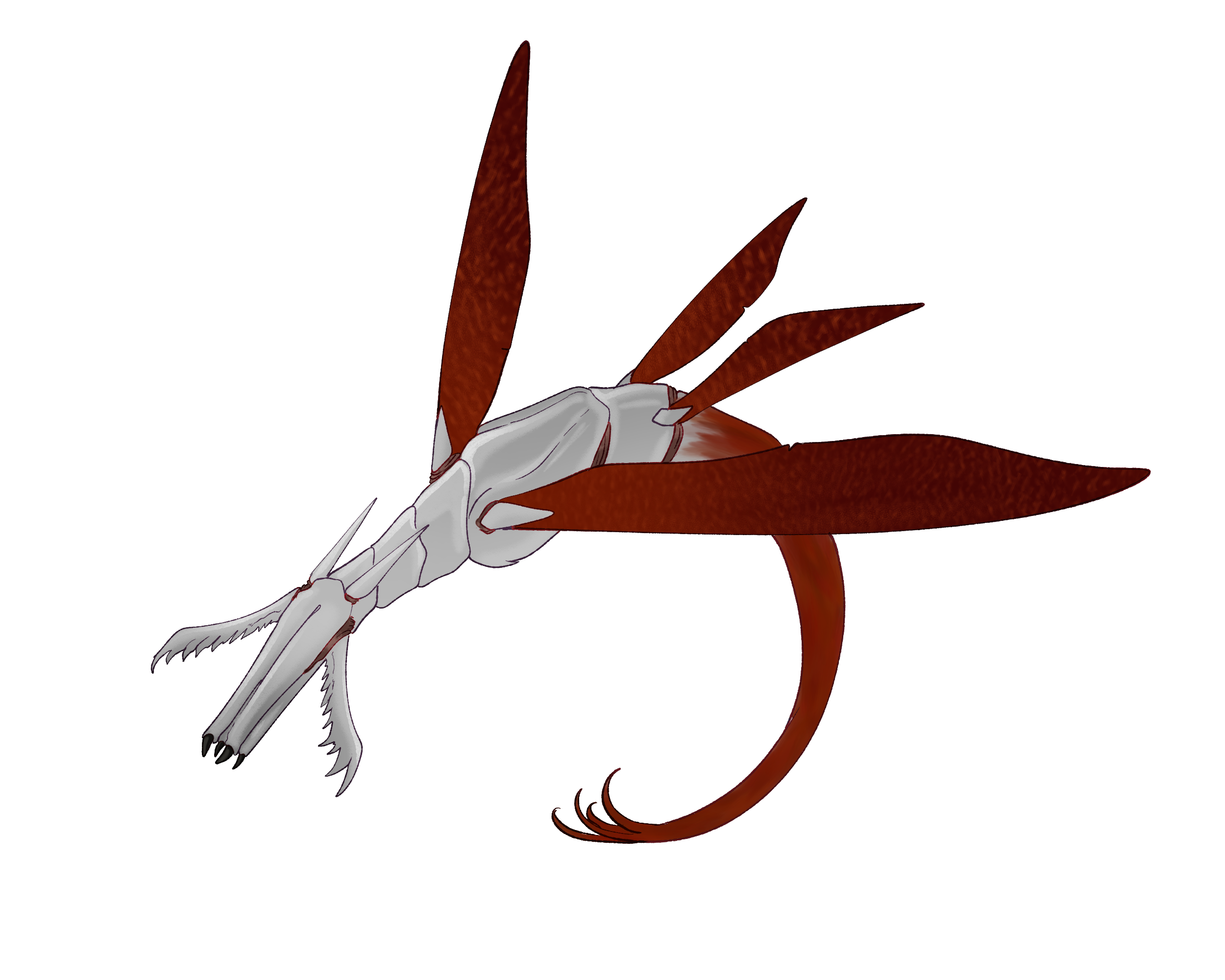 The insect is of medium size, it bears no legs and relies solely upon its four crimson wings. The antennae is thick and horn like. Mandibles splay out to the side of its jaws. The red tail is soft and velvety. These insects are mostly solitary but can be observed in small groups. Thi’scweffeen often swarm around palefruit bushes. Their red tails exposed just like the fruit. Drawing in smaller grazing insects from which their mandibles perforate and shred their preys hide. Their long face able to drink the juices from the deceased.
