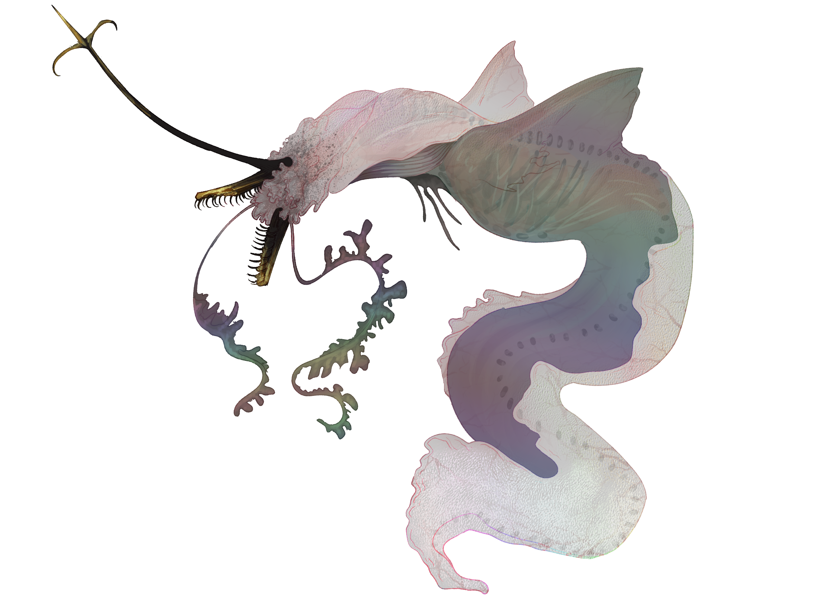 Translucent fleshy extensions that act like whiskers droop off its face.