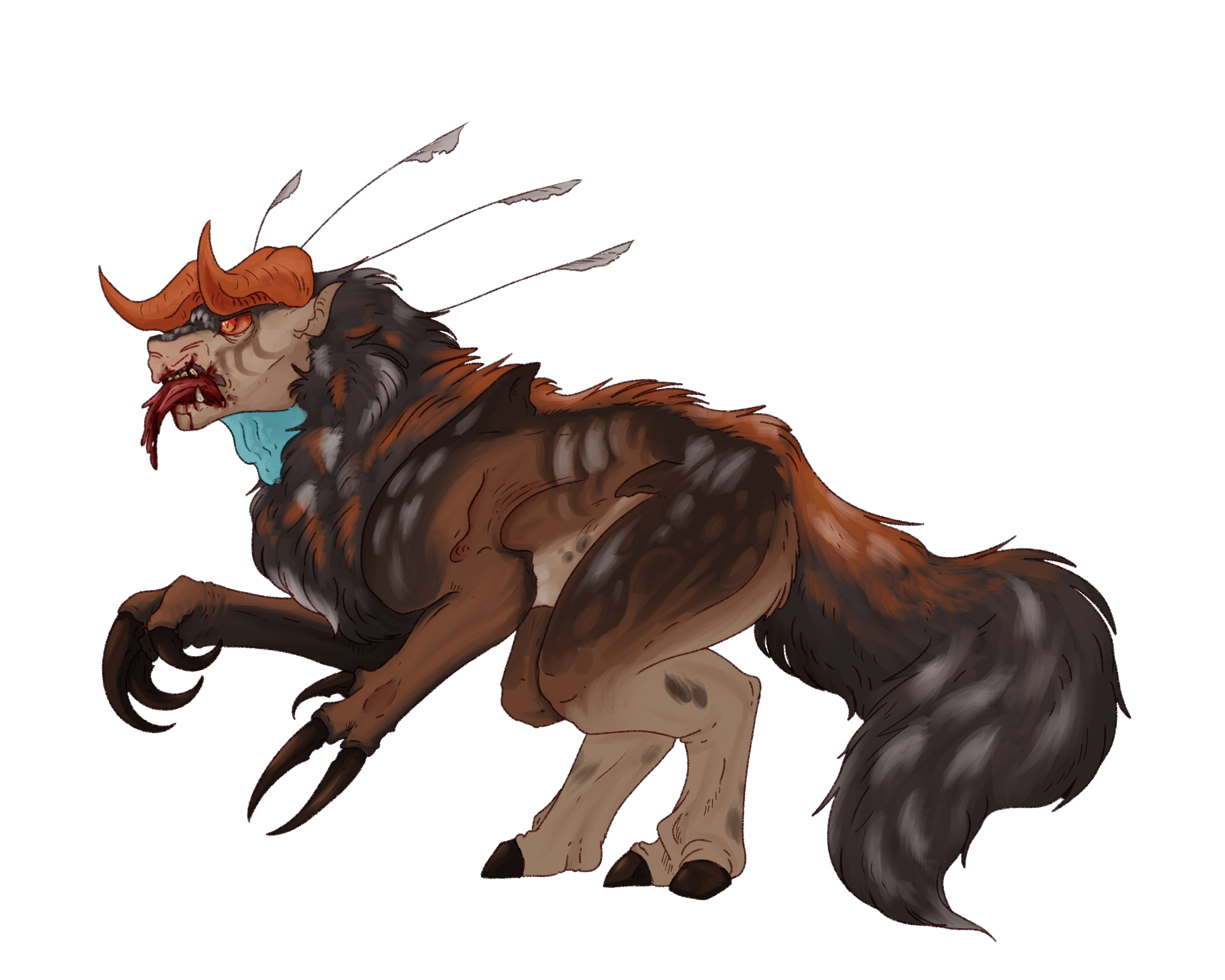 The Arogratar is a large predator native to the Norüʐgà Saltʐ Field. These beasts are solidary, prefering to ambush prey alone. Though they are not outwardly aggressive to each other; they certainly are not friendly. These beasts prefer a semi-nomadic life and are ambush predators. With their long legs one would spring out of a bush, and with their claws and the springloaded force. Pierce or catch a tight hold of anything to then maul. Their flat cow-ish nose acts like a guard to spines and spikes, with its fatty deposits taking the brunt of the blows. The bright blue dewlap is used in courting rituals. Its horns are used for nest making, scoring the ground and pushing rocks. The long feathers that protrude from the backs of their necks are wyrm sensors. Capable of picking up any wyrm currents and alerting the Arogratar an underground threat approaches. An adaptation devised to protect mainly their young from wyrms such as Lesser Drillhörns, Goldenglàshes, and Kériüstills. Though, Goldenglàshe will still prey upon adult Arogratar if the opportunity reveals itself.