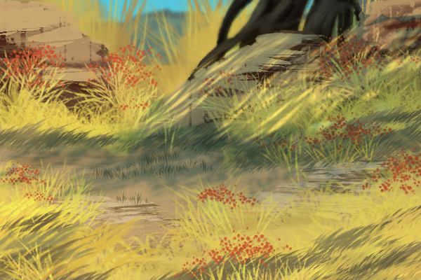 Arogratar historically and still due inhabit the Norüʐgà Saltʐ Fields. The fields and their lush desert grasses and high arching trees with sprawling leaves are their home. Clusters of bolders and rocks lay littered about the ground. Many other beasts call these fields home
